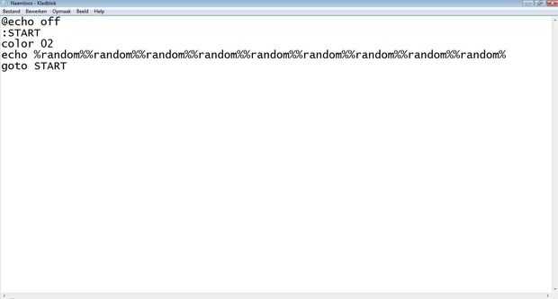 para los que preguntan, es cómo hacer un efecto de "Matrix" en el Bloc de notas.Paso 1: Abrir Bloc de notas Como el título dice, Bloc de notas abierto.Paso 2: Copiar y pegarCopiar y pegar esto en Bloc de notas:decolor 02: Inicioecho %random%%ran
