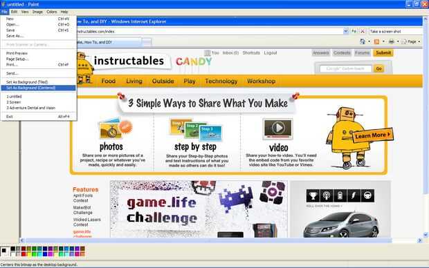 Guardar la pantalla en paint, luego seleccione establecer como fondo de escritorio. Esto se encuentra en archivo. Si pide, necesita ser establecido para estirar o centrado, no azulejos. Si no funciona el ajuste centrado, entonces vaya a donde usted pone su fondo y normalmente seleccionar tramo desde allí.