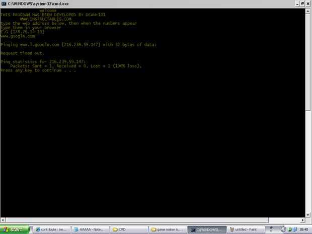 Esto se hace también solamente ayudar a la gente bajo soporte de archivos por lotes más! sólo hacer ping a la página web y dar la dirección ip sino que se utiliza mucho de los códigos de lote diferentes para ayudar a las personas a aprender a usarlos. Si el servidor te bloquea direcciones ip y web a encontrar un sitio proxy.