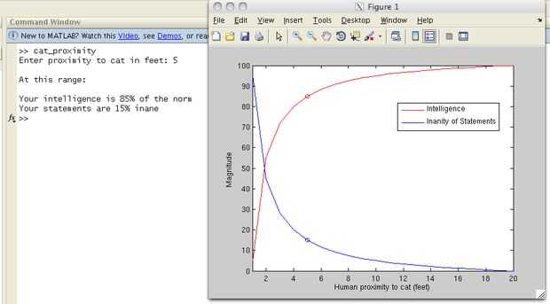 Terminé un laboratorio temprano una vez y decidió que era el uso más eficiente de mi tiempo hacer un programa que simula la proximidad de gato XKCD, siendo uno de mis favoritos. El programa solicita al usuario una distancia a un gato en pies y luego darle el ajustado nivel de inanidad de inteligencia y declaración (x % de inteligencia normal, la declaración es inane y %) así como trazar el punto de ambos en un gráfico basado en el en el cómic. También hay un límite de distancias extremadamente cercano y lejano.