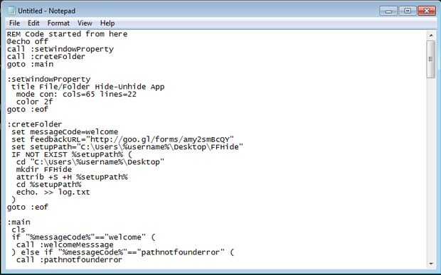 Copie el código siguiente en Bloc de notas y guárdelo como FFHide.bat