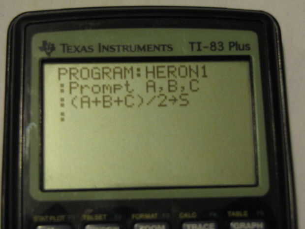 Ahora presiona enter para ir a la línea siguiente y escribir (A + B + C) / 2 -> S. Esta manera, no incluso tienes que averiguar cuál es el semiperimetro. Para obtener el símbolo de flecha, empuje el STO -> botón (justo encima del botón de encendido).