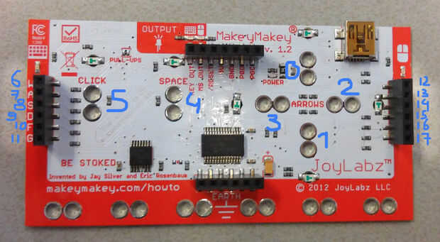 La primera variable en este código es códigos de teclas [NUM_INPUTS]. Esta variable es un array que contiene valores de 18. Cada valor representa una clave o ratón de entrada y tiene su propio índice. KEY_UP_ARROW es el índice 0, KEY_DOWN_ARROW es Índice 1 y así sucesivamente. Estos números de índice coincida con las entradas MaKey MaKey en el tablero.