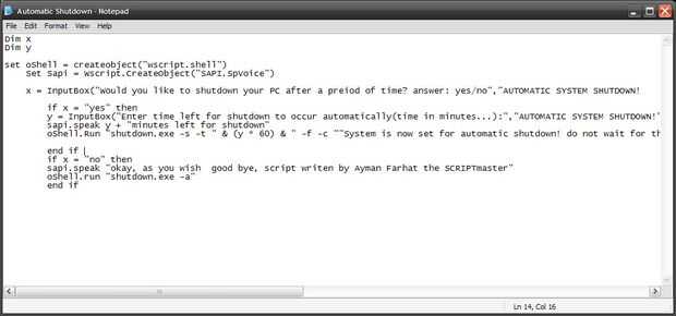 oShell.Run "shutdown.exe -s -t" y (y * 60) & "-f - c" "sistema está listo para el apagado automático. no esperes para que las descargas hasta el final, usted puede ir a dormir! ¡Buenas noches! ¡ nos vemos 2morow! >>>> para terminar este apagado automático simplemente volver a ejecutar el script y el tipo no "" "