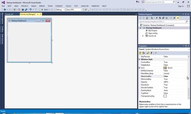 Antes de hacer cualquier codificación, tenemos que configurar el GUI o interfaz gráfica de usuario para que se vea agradable y amigable de usuario. En primer lugar, debemos cambiar el texto en el campo de "Texto" se muestra en la esquina inferior derecha para "Tablero de arranque". A continuación Desplácese hacia abajo hasta la opción de"máximo" en la categoría "Estilo de la ventana". Cambiar la opción de true a False.