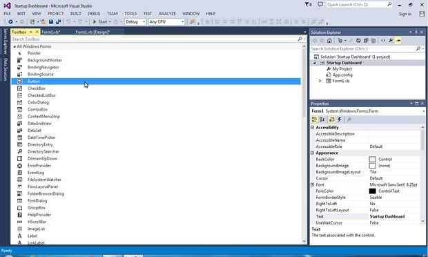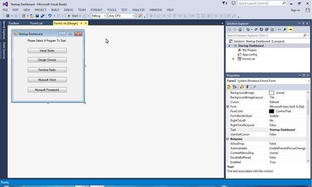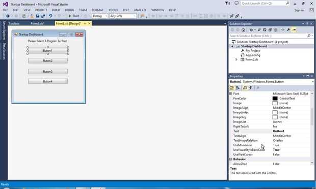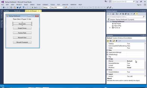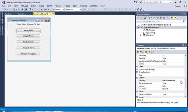 Ahora que la etiqueta se hace, es hora de agregar botones. En su caja de herramientas y desplácese hasta que vea el objeto "Button". Haga doble clic en eso y hacerla tan amplia como su etiqueta. Usted puede lograrlo igual que tamaño de una imagen en Microsoft Word. También alinea el auto para ayudarte así. Después de dimensionarlo, haga clic derecho y seleccione "Copiar" en el menú desplegable. Pegar este botón cuatro veces más para un total de cinco botones. Les de espacio a tu gusto. Para cambiar el texto del botón, simplemente haga clic en el botón una vez, entonces ve a la esquina inferior derecha y desplácese hacia abajo hasta "Texto". He nombrado mis botones "Visual Studio", "Google Chrome", "Pandora Radio", "Microsoft Word" y "Microsoft PowerPoint". Después cambió el texto, ir por el mismo proceso pero en la sección "Nombre" debajo de "Texto". Todo lo que necesitas hacer es cambiar de "Tecla *" a "btnYourProgram". El resultado final debería verse como la última imagen en diapositivas de este paso. Puede cambiar a cualquier programa en su computadora, usted apenas necesita cambiar el código que había hecho. Si usted necesita cualquier ayuda con eso solo me dispara un comentario.