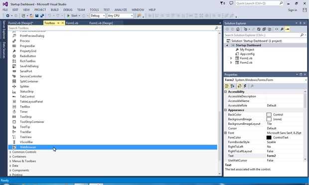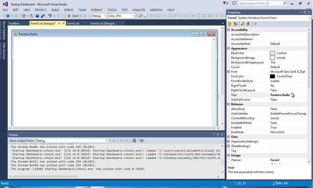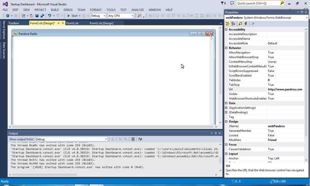 Ahora que tienes tu nueva forma, cambiar el tamaño a una ventana ligeramente grande. Después de eso, entrar en tu caja de herramientas y desplácese hasta el objeto "navegador Web". Haga doble clic en y el interior del formulario debe girar a la blanco. Después de eso, tenemos que cambiar el texto del formulario 2 a decir "Pandora Radio". Para hacer esto, haga clic en la parte superior del formulario, ir a la esquina inferior derecha y desplácese hasta «Texto». Sólo cambia "Pandora radio". Después de cambiar el nombre del formulario, tenemos que configurar el "navegador" para abrir Pandora cuando está activo. Para hacer esto, haga clic en la parte blanca del formulario, ir a la esquina inferior derecha y escribe "http://www.pandora.com" y cambiar el nombre a "webPandora".