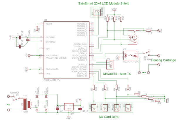 Para medir la temperatura, utilizamos un termopar tipo K y tablero de regulador del MAX6675 (MOD-TC). El MAX6675 chip tiene un convertidor de anuncio interno de 12 bits y puede ser conectado mediante una interfaz serial. La pantalla LCD (SainSmart CII/I2C/TWI 2004 serie 20 x 4 LCD módulo de pantalla), está conectado con el puerto de I2C del Atmega y la tarjeta de interfaz de la tarjeta SD está conectado con la interfaz SPI. Para navegación y configuración de los parámetros se utiliza un codificador rotatorio con pulsador integrado.