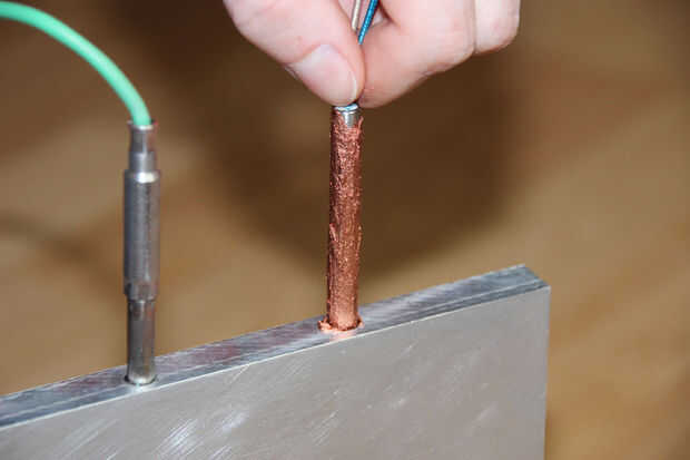 Empezar por la perforación de los orificios de los cartuchos de calefacción y el termopar. Esta parte es un poco complicada y sin duda necesita un taladro para este paso. Usted también puede tratar de utilizar dos placas de aluminio y máquina de fresado con una fresa de nariz de bola. A continuación, taladre los orificios para las barras de hilo de acero y tornillos de fijación en las placas de aluminio y soporte de metal. Si desea utilizar un interruptor térmico como dispositivo de seguridad, También Perfore los agujeros correspondientes en la placa de aluminio. Lubricar el cartucho y termopar con la pasta de cobre para mejorar la transferencia de calor que el aluminio. Luego utilice los tornillos de bloqueo para sostenerlos en la placa.
