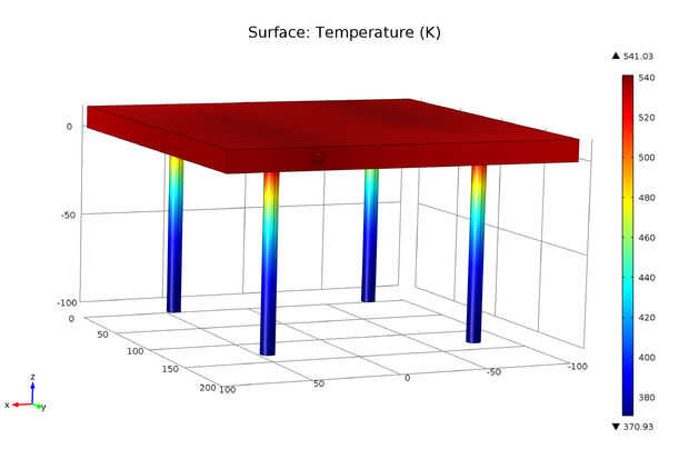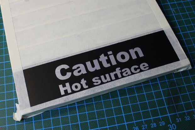 Para conseguir una impresión cómo caliente la carcasa metálica del consigue apoyo, simulado el perfil de temperatura de la placa y las barras de acero debajo de la placa. Resulta que en el 540 K (270° C, 518 F) las barras de acero son unos 370 K (° C 97, 206 F) caliente. Desde limitar la temperatura a 180° C, yo pude que también han usado una caja de madera.
