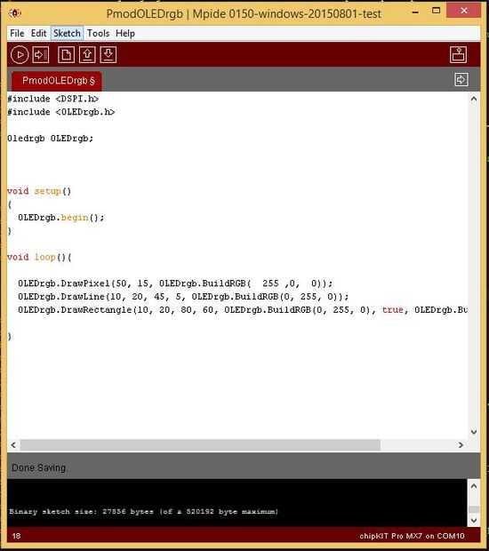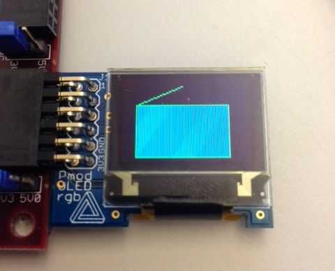Usted puede encontrar varias funciones en el archivo OLEDrgb.c incluido en la biblioteca. Estas funciones incluyen DrawPixel, DrawLine, DrawRectangle y DrawBitmap. También es una función auxiliar denominada BuildRGB(red,green,blue) que formatea el color RGB en 2 bytes que pueden ser leídos por el PmodOLEDrgb.