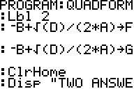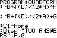 PRGM). Escriba las dos ecuaciones: -B + sqrt(D)/(2*A) y -B - sqrt(D)/(2*A). Almacenar estas como variables F y G. Entonces usted necesita mostrar las respuestas. En primer lugar, limpiar la pantalla de inicio (