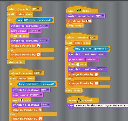 Si vas en el sprite de la etapa, se verá un bloque de programación a partir con el comando "cuando clic en bandera" con muchas cuadras después. En este programa tiene tres bloques "if" dentro de un gran bloque "para siempre". Lo que esa cadena de gran programa está diciendo es, elegir una orden aleatorizada, derecha, izquierda o arriba. Para cada izquierda, derecha, o comando hay un programa dentro de ella diciendo: difusión y juego el comando de voz.