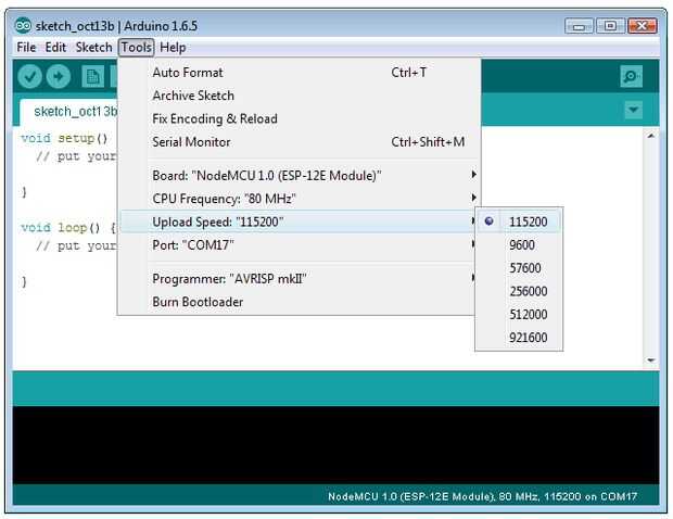 Para seleccionar la velocidad de comunicación entre la ESP8266-12E y el ordenador. Ir a "herramientas de| "Velocidad de subida: y seleccione 115200. Estamos dispuestos a subir nuestro primer boceto.