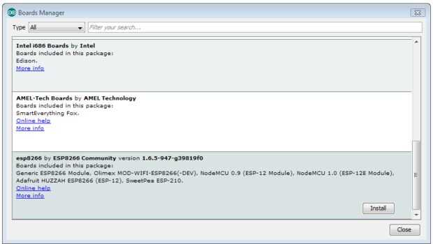 Abrir "herramientas | Consejo: | Tableros de Gerente" cuadro de diálogo. En alguna parte allí, verá la entrada "esp8266 de ESP8266 comunidad" seleccione. Aparecerá el botón instalar , haga clic en el botón instalar . Espere un rato... Este proceso tomará algún tiempo para descargar y completar. Después de la instalación me cierra el programa de Arduino y lo reinicia.