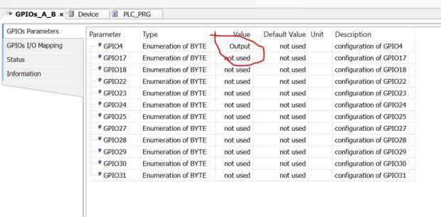 -En la fila GPIO4, definir la GPIO como salida cambiando el cuadro de valor a la salida de doble clic sobre ella y seleccionar "Salida" (ver imagen).