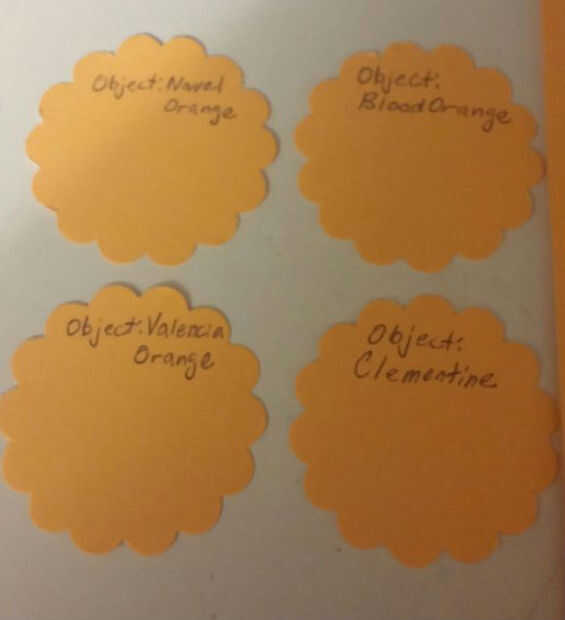 1. nombre de los objetos escribiéndolos en las formas con el lápiz. 2. aquí, se denominan "NavelOrange", "ValenciaOrange" y "BloodOrange" y "Clementina"