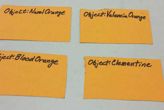1. nombre de los objetos escribiéndolos en las formas con el marcador. 2. aquí, se denominan "NavelOrange", "ValenciaOrange", "BloodOrange" y "Clementime".