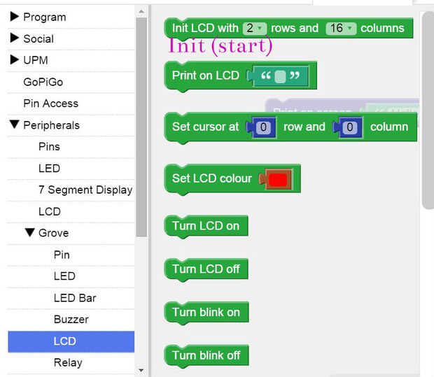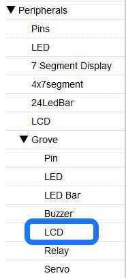 Primera: Periféricos, haga clic en, haga clic en Grove, haga clic en la pantalla LCD en el panel izquierdo. Cuando lo seleccione, se mostrará todas las opciones posibles a la derecha. Elegir la parte superior dos bloques, se añadirá al área de trabajo de la derecha.
