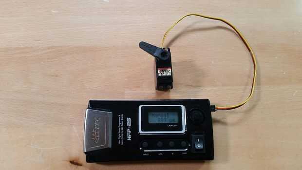 Tapa el interruptor. El programador mostrará 'HFP-25' durante unos 4 segundos y luego abrirá la última pantalla que fue antes de ser apagado. En este caso, es el modo de prueba manual. Cuando se utiliza el programador siempre es la última pantalla que veo antes de apagarse ya que me gustaria probar el servo en el modo manual antes de instalar mi servo en un proyecto. Si usted tiene un servo nuevo no sería una mala idea para probar el servo funciona correctamente usando el modo manual en este momento.