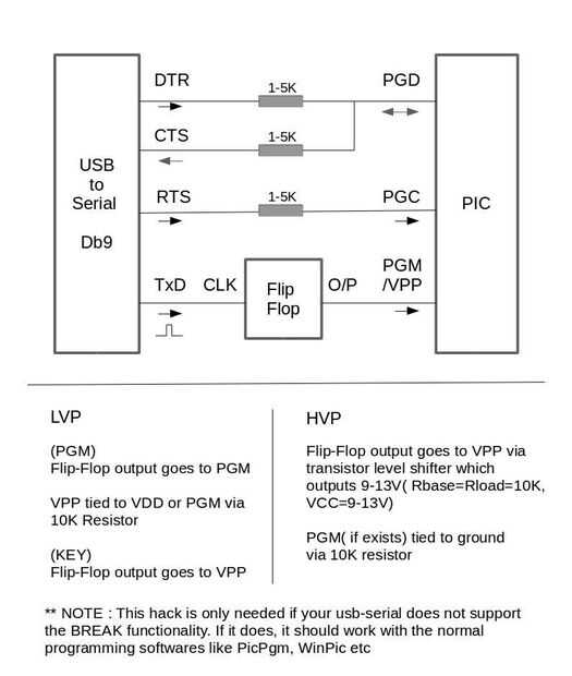 Nota: Este hack es necesario sólo si su usb-serie no admite la funcionalidad de la rotura. Otra cosa, puede que funcione con como es, con el software de programación habitual como PicPgm, WinPic, etc..