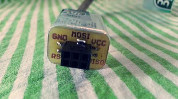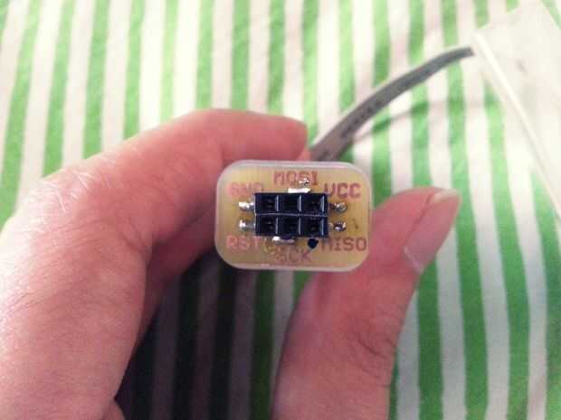 Corte 2 cabezales hembra de 3 pines y les pegan para que formar un conector hembra de 3 x 2. Ahora coloca en parte superior y sus alfileres en la parte inferior de la soldadura. Por último, poner los cables del cable de cinta saliendo de la parte inferior del tic-tac mini y les de la soldadura de la misma manera que entraron en el tablero principal. Inserte el cable rayado rosa en el agujero con el dot(MISO) y el siguiente de VCC, entonces SCK y así sucesivamente.