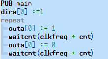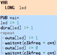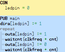 El programa anterior, meter en la herramienta de hélice y golpear F10. Rápidamente se compilar y cargar en la hélice. El código parpadeará un LED conectado a P0 cada otro segundo (1/2 hertzios) para siempre. Desglosemos cada línea para entender lo que está haciendo;