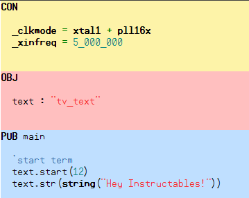 El bloque de obj indica al compilador: "Si me refiero a un método (PUB o PRI) en otro archivo, este es donde usted debería". Yo te Reserva una discusión completa de la utilización de objetos para otro instructivo, pero por ahora, pensemos en objetos como una forma de incluir el código de otros.