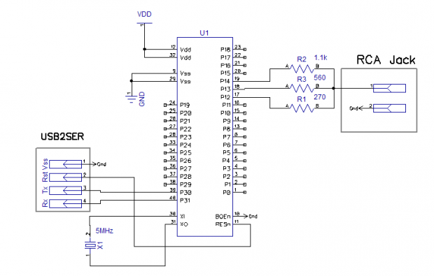 Un cristal de 5MHz en los pines 30 y 31. La hélice necesita cierta velocidad y precisión para generar datos de vídeo, el apoyo será tomar ese cristal de entrada de 5MHz y multiplicar por 16 para una velocidad de reloj de 80MHz.