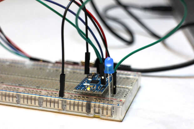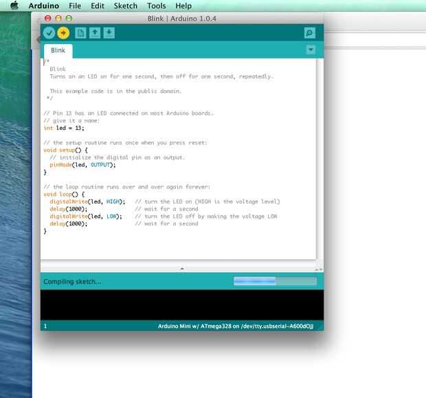 Recoger lo LED, conecte el lado positivo al pin 13 (valor predeterminado en el dibujo de ejemplo) y el suelo con un conector de tierra. Si parpadea, significa que éxito!
