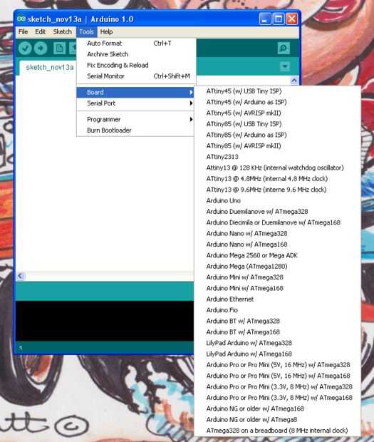 En la imagen que muestra mi IDE puede ver la lista de consejos que tengo para elegir. Hay una opción para el ATtiny2313 sin opciones de reloj.
