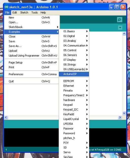 En mi foto 3 puedes ver que estoy cargando el bosquejo de ArduinoISP. Esto hace que el Arduino capaces de programar otros chips. También tenga en cuenta en la parte inferior del IDE tengo el tablero ATmega328 elegido para cargar el sketch de ArduinoISP en. El nombre de Junta completa está bloqueado en la imagen así que aquí está: Arduino Duemilanove w / ATmega328. Mi puerto está en COM2.