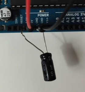 Por último, poner un condensador de 10uF entre GND y RESET de tu Arduino (no olvide respetar la polaridad). Esto evita el Arduino auto reseteo.