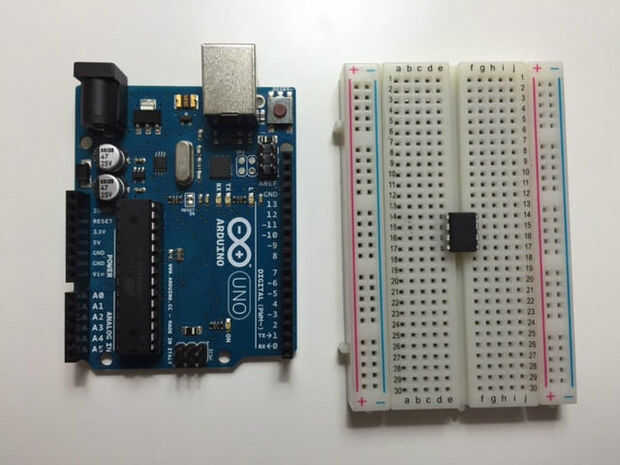 Desenchufe su Arduino y coloque el Attiny en el protoboard como se muestra arriba. Conecte cables de puente de tu Arduino a la placa en la siguiente configuración: