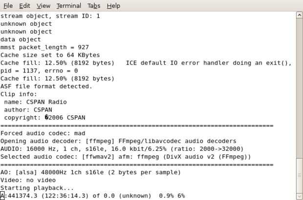 "mms://rx-wes-sea20.rbn.com/farm/pull/tx-rbn-sea34:1259/wmtencoder/cspan/cspan/wmlive/cspan4db.asf" de MPlayer - ao pcm:file=/tmp/mystream.wav - maniquí - vc null vo;