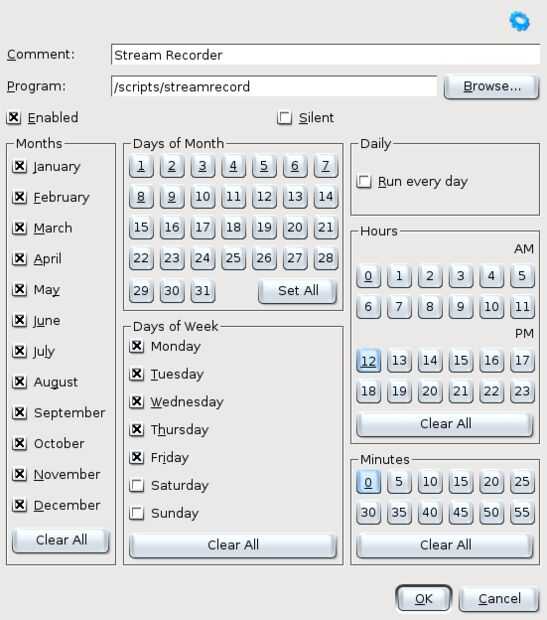 Cron, el maravilloso pero muy confuso el pequeño archivo de texto y servicio asociado merece toda una serie de instructubles a sí mismo. Para hacer las cosas más simples, vamos a utilizar KCron (que instalamos anteriormente) en su lugar. Si la instalación fue como estaba previsto, veremos KCron en aplicaciones--> herramientas del sistema. Alternativamente, el programa puede ser ejecutado desde un terminal escribiendo "kcron". Utilice CTRL+n para crear un nuevo trabajo y configurar el trabajo como se muestra en la imagen. En la imagen se puede ver que configuré el programa /scripts/streamrecord para ejecutar todos los meses, de lunes a viernes a las 12:00 con 0 minutos.