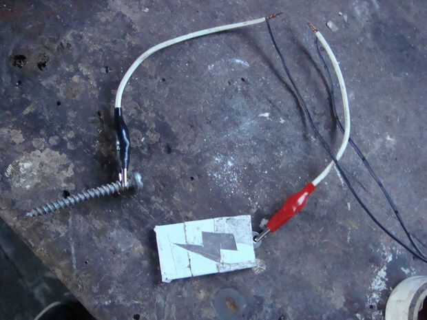 Y conectamos el transformador DC a la corriente, y ponemos el polo positivo en la pieza de metal, largo de tornillo de y el negativo en las Naciones Unidas.