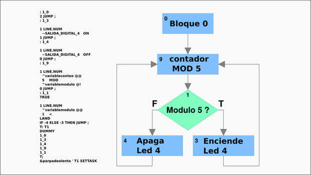Se desarrollo un programa ejemplo "PARPADEO", cuenta con dos tareas: una enciende y apaga una salida digital e incrementa una variable contador, la otra tarea revisa si la variable es exactamente divisible entre 5 (modulo 5) y enciende el led cuando esta condicion es valida, de lo contrario, lo apagara.