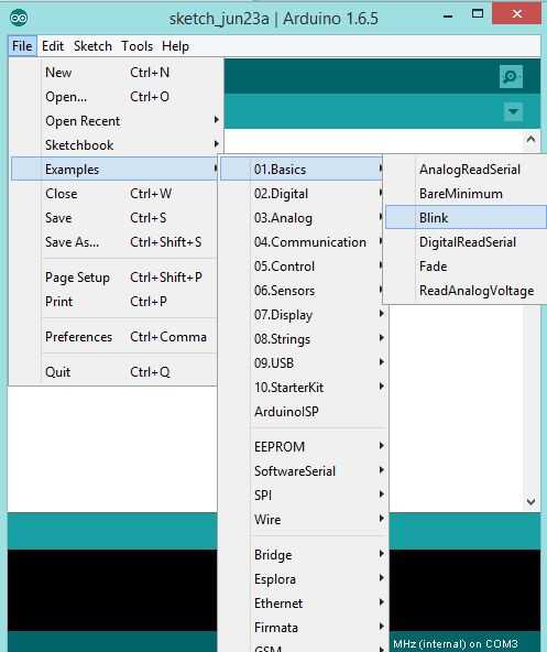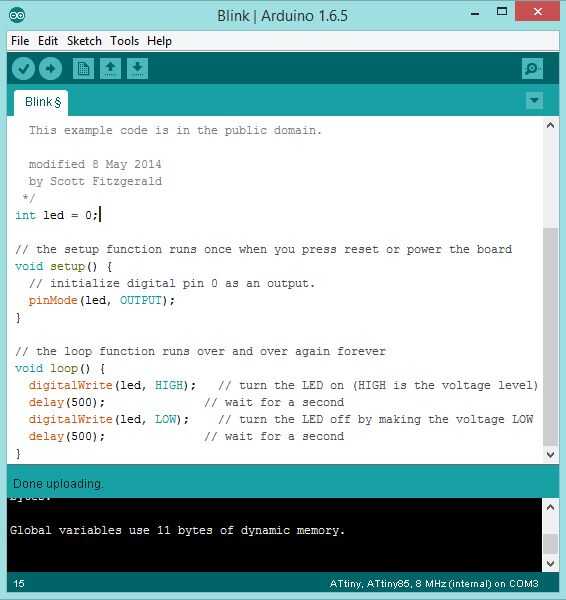 Un buen programa primero para probar su nuevo chip es el programa de parpadeo en ejemplos. Se desea cambiar el valor del pin para algo entre 0 - 4. La imagen de arriba muestra que pines digitales corresponden a que pines físicos. Los pines digitales son lo que usted va ingresar en Arduino. Para este ejemplo hice pin digital cero.