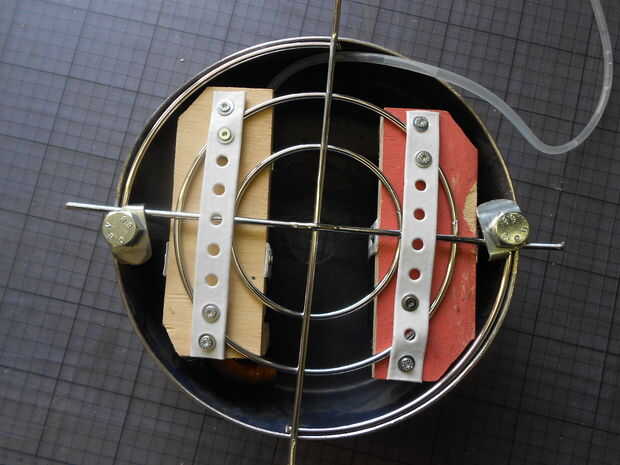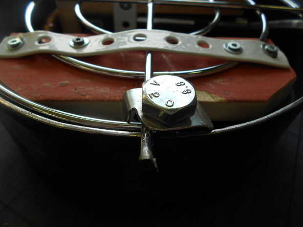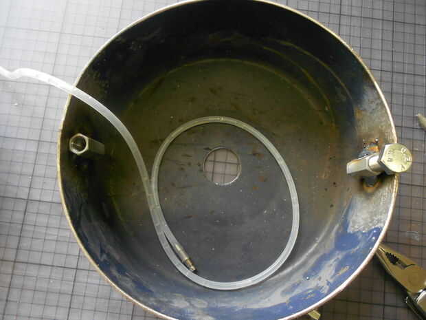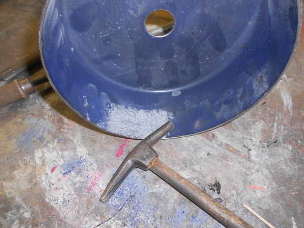 Pronto me di cuenta que necesitaba algo para fijar la rejilla en la olla y pidió a los chicos de"metal" a dos tuercas de la autógena en el bote, pero tenía que deshacerse del esmalte primero. Simplemente había martillado (uso gafas de seguridad y protección para los oídos en este paso!) y lijar un poco. A continuación, las tuercas pueden soldarse en.