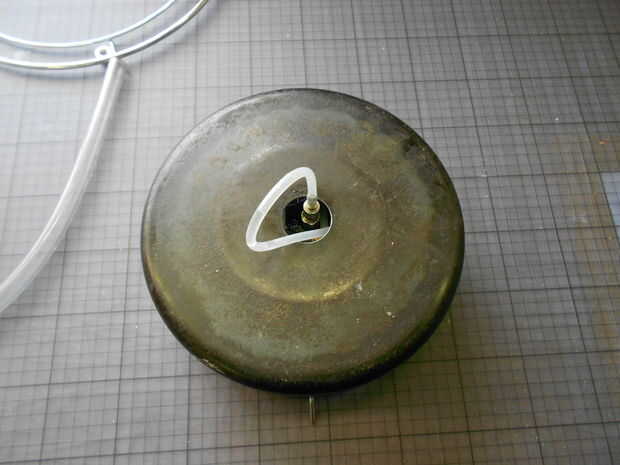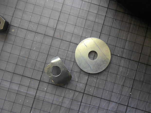 Un problema resuelto, una nueva creada: el espacio entre tornillo un pote fue a pequeño para el cable de red a pasar por... Así que tomó a algunas arandelas grandes cortadas y dobladas en una especie de un gancho y se deshizo de dos cuartos opuestos del anillo exterior.