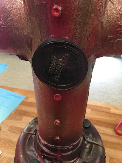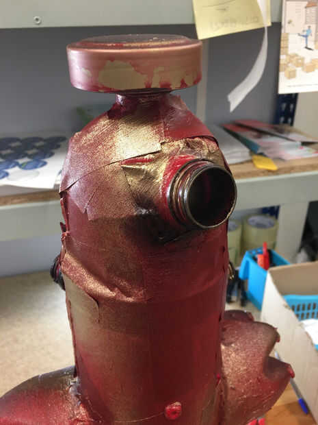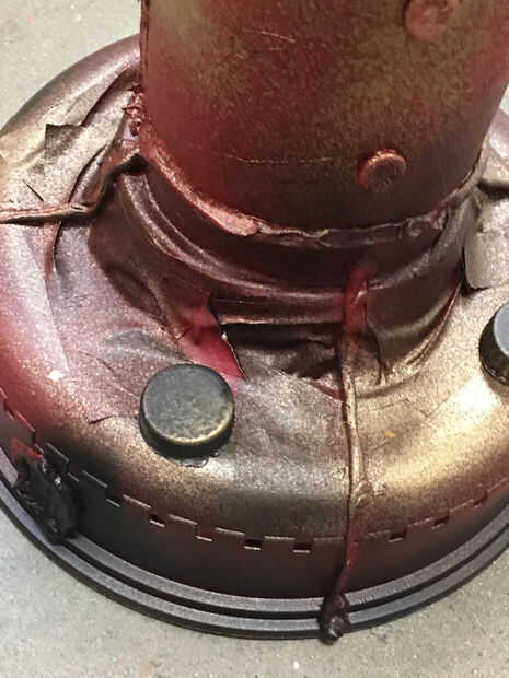 Utilicé las tapas de botella, que habían sido rociado oscuro y caliente pegado en la base para ver como los pernos/tuercas de tierra. He añadido las tapas del café como las placas frontales, placas de tipo de la identidad de ciudad. y colocado en la parte superior, como una válvula de algún tipo. Esto también oculta la forma de la botella pop bastante bien.