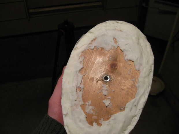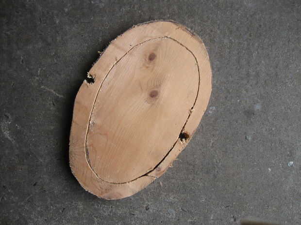 - Dale la vuelta para revelar la madera en la parte inferior y perfore un pequeño agujero en la madera sólo lo suficientemente profunda como para insertar la tuerca que se adapta a su trípode. Epoxi en lugar, una vez seco puede atornillarse en su trípode. El propósito del trípode es para facilidad de uso más adelante.