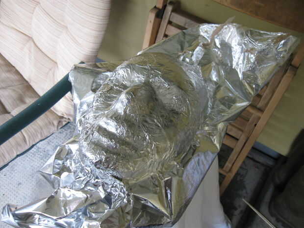 • Deposite una parte de aceite papel de aluminio sobre la mascarilla y presione hacia abajo todo.  Pulse en todas las depresiones, formando la cara.  Mientras la resina se seca el papel mantendrá la hoja trabada en su lugar manteniendo todas las características de rostros afilados.