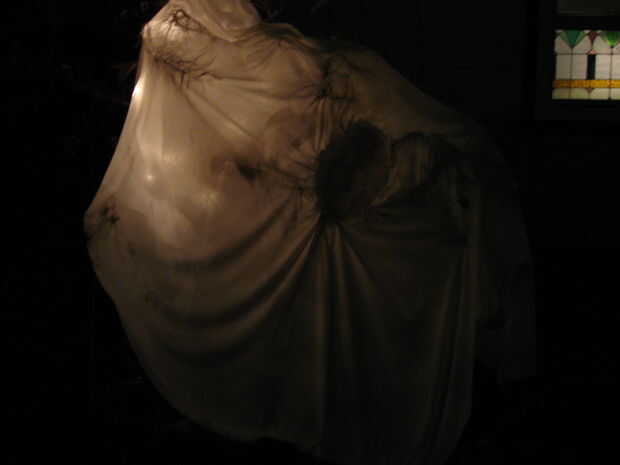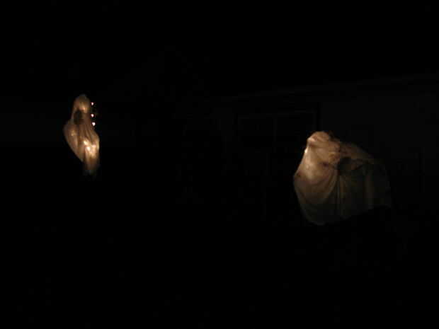 Tiro sus fantasmas sobre árboles, arbustos o colgar en puertas. Si cuelga en una puerta puedes hacer uno donde insertar múltiples caras en la misma hoja. Luz usando luces de Navidad, tubo fluorescente, las luces de inundación o de las mejores luces de negro efecto. ¡Que te diviertas!