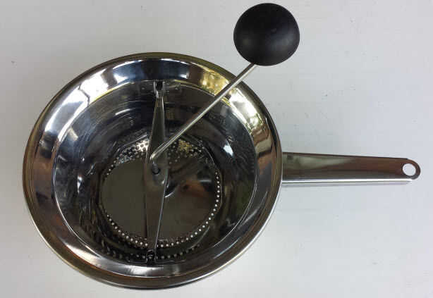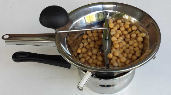 Ahora convertir los garbanzos en una pasta, utilicé un colador de verdura / comida molino porque me gusta la consistencia de los garbanzos después. Pero fácilmente se puede sustituir por una batidora, procesador de alimentos o incluso una licuadora.