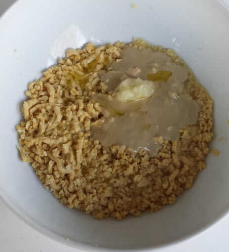 Luego, utilizando una cuchara grande, mezcla de semillas de sésamo, ajo, jugo de limón, aceite de oliva y sal.