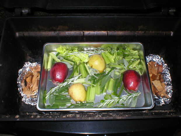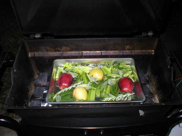 Puse algunos apio, manzanas y peras junto con algunos Romero y la salvia en la bandeja de goteo y llenarlo 3/4 llena de agua. Esto ayuda a mantener las cosas bastante húmedo interior durante la cocción y sabor el pájaro.
