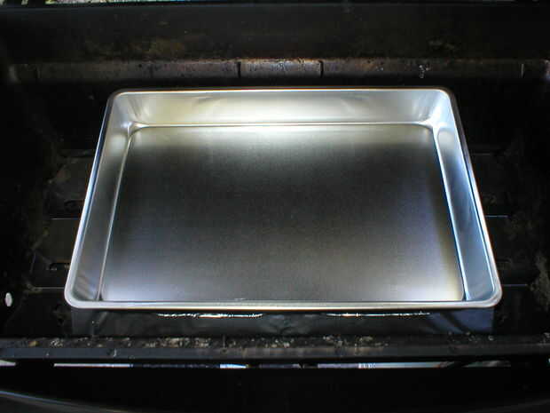 El siguiente paso es configurar las cacerolas del mollete y la bandeja de goteo. Usar las cacerolas del mollete hoja como espaciadores de soporte para la bandeja de goteo. Puse las cacerolas del mollete directamente sobre la lámina de la placa inferior y luego ajuste la bandeja de goteo encima de ellos. La razón de hacerlo es intentar proteger la bandeja de goteo un poco de calor de la placa inferior y las cacerolas del mollete son lo suficientemente flexibles para los un poco a la bandeja de goteo para caber debajo de la parrilla. Con el recipiente sobre la placa inferior un poco, los líquidos en la bandeja de goteo no hervirla lejos tan rápido como lo harían si la bandeja de goteo estaba sentado encima de ella. Nota: La mayoría del líquido hervirá a fin y, al final de la cocción, tendrás grasa de pavo sobre todo por lo que no será útil para salsa de grasa.