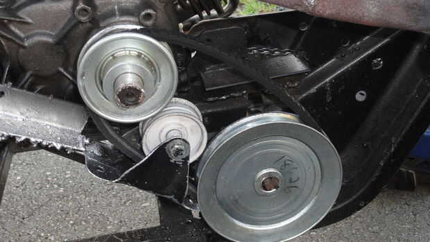 En cuanto al sistema de tracción que todo el polaris original fue quitado porque ya no se usa, así que en vez que montado un eje de unión a la placa de montaje original para la transmisión. Una vez que se realiza un piñón es necesario para a transferencia de la potencia desde el eje intermedio en el piñón de la impulsión principal. Si nos fijamos en la imagen es una configuración relativamente simple para el sistema de impulsión. Una rueda dentada y embrague centrífugo funcionaría mejor. Pero nuestros teniendo una reducción del engranaje no pensamos que daría vuelta para arriba bastante velocidad para activar el embrague y no lo construimos para velocidad cualquiera. El tamaño de polea como hemos hecho una aún mayor reducción del engranaje de darnos mucho de tirar energía pero la correa no tener la frivtion necesaria para tirar de mucho peso por lo que es un poco difícil de conseguirlo en una pendiente. Se activa la polea de tensión con un apretón de mano montado en un mango.